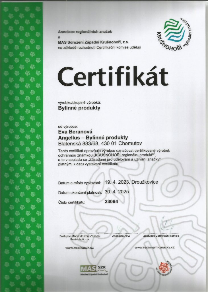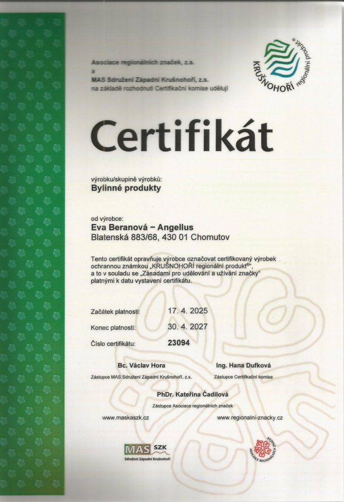 V roce 2023 jsme získaly certifikát KRUŠNOHOŘÍ regionální produkt, na jaře 2025 jsme certifikát obhájily. Máme registraci u SZPI a podléháme pravidelným kontrolám.